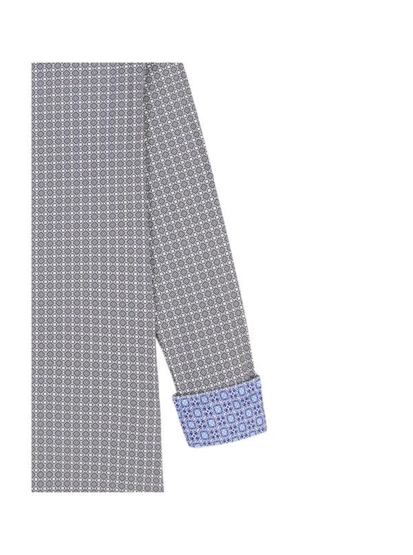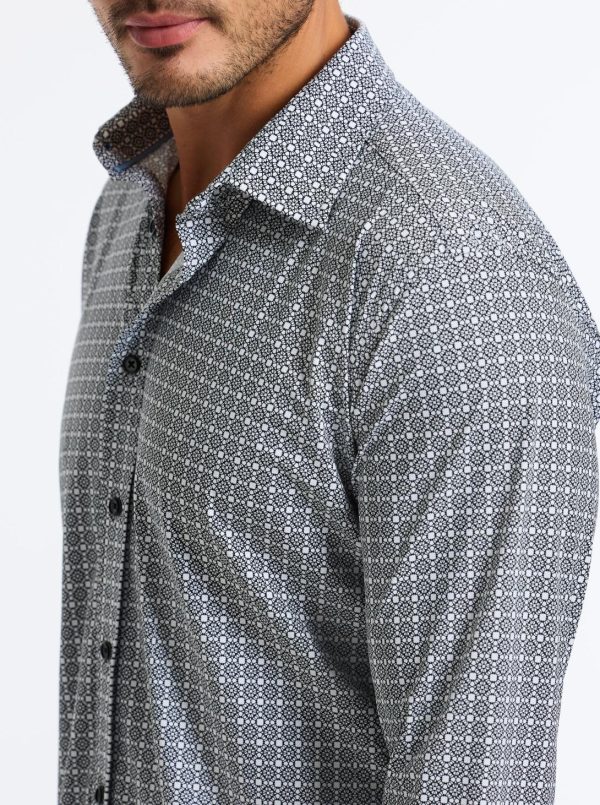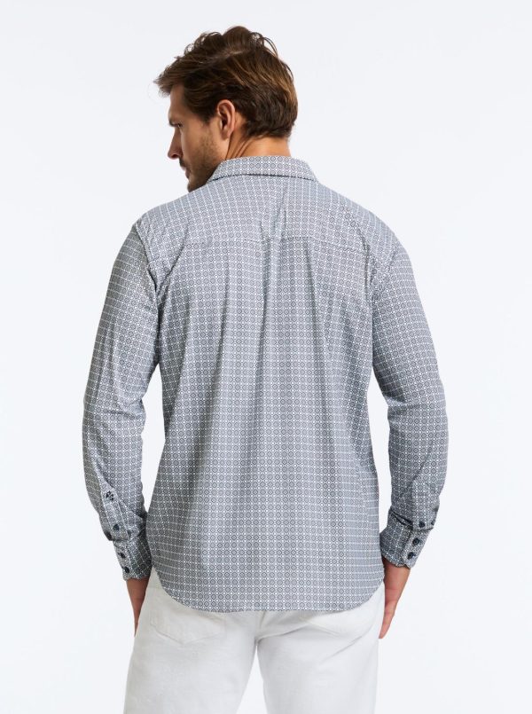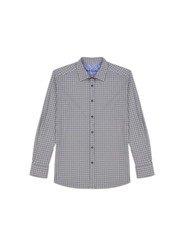 A classic button down in an allover geometric circle print is the perfect piece for just about any occasion. Dress it up with a blazer or dress it down with casual denim. No matter what you choose, RG nylon motion knit gives this style the freedom to move with you, no matter where the day might take you. Notice the contrast print at the collar for an elegant finishing touch. Note: This style is slightly fitted. It is tailored for a closer-to-the-body fit, with all the RG personality you expect.