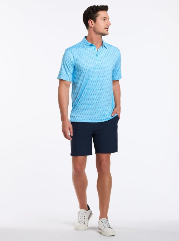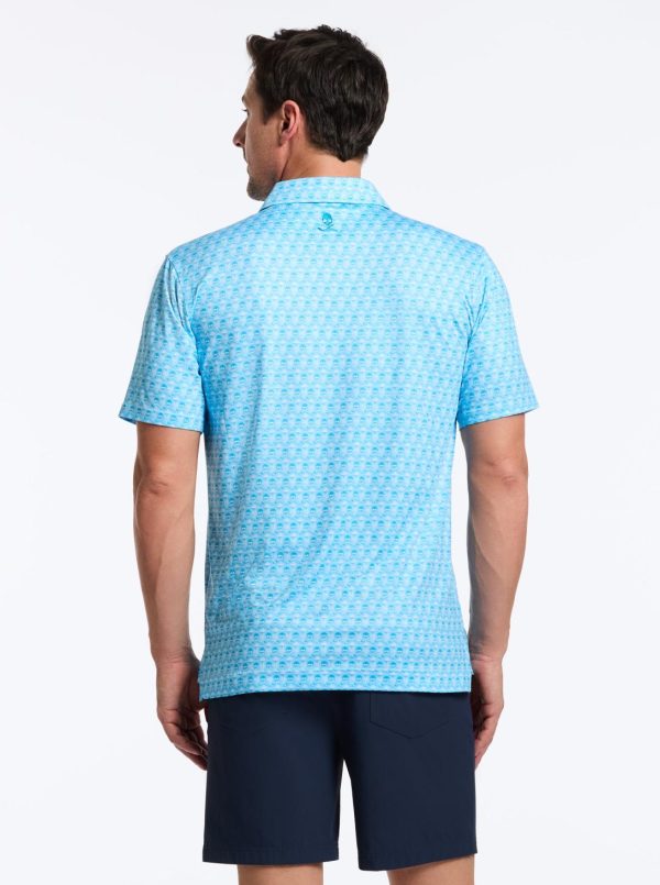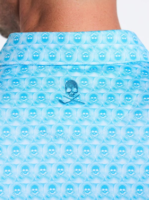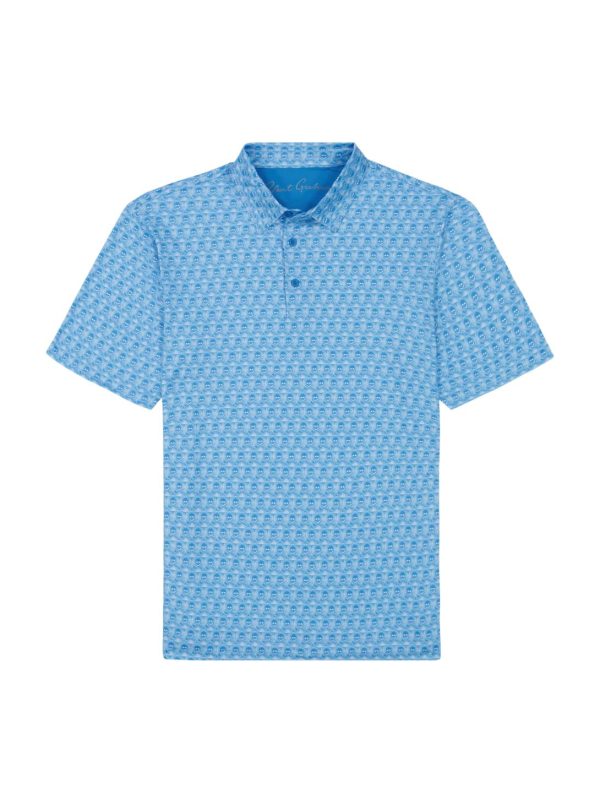 A basic polo from afar becomes an interesting fashion piece up close. Notice the micro skull-and-cross club print that creates an unexpected allover design.