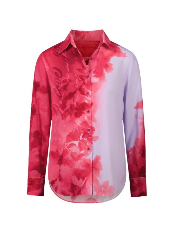 Part of our Love Letter series, this silk shirt embodies effortless femininity. The soft faded print evokes the romantic hues of a sunset, while the hidden “I love you” note adds a touch of secret poetry. Delicate pink jeweled buttons and cufflinks complete the look with a playful, new-love sparkle.