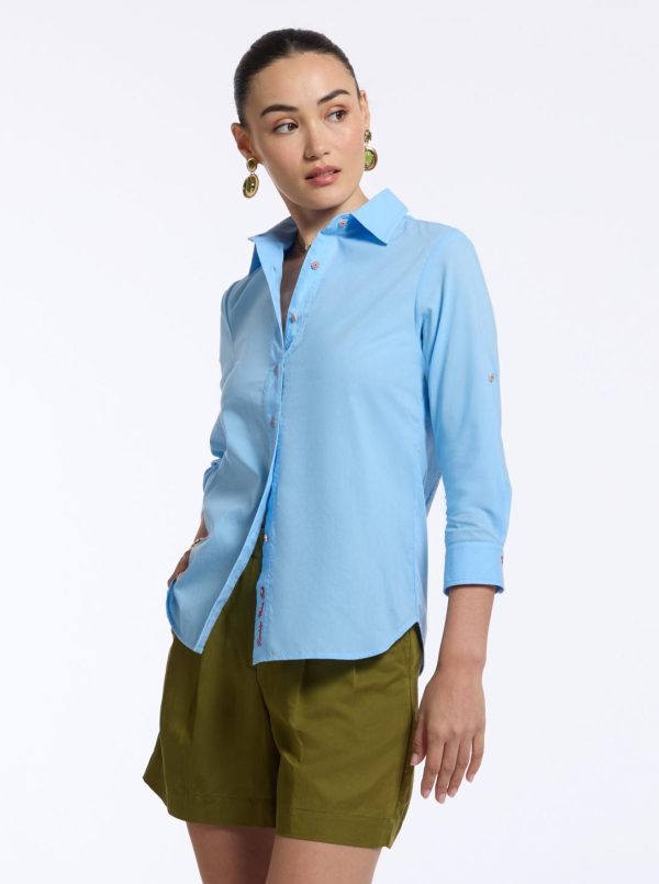 This button down in breathable linen adds a fun spin to a basic style. Turn around and admire the view of a chateau while sipping wine in the vineyard. A wreath of florals and sculpted cherubs create a beautiful visual frame. Contrast embroidery at the collar and side seams adds unexpected detail. Don’t miss the floral embroidery at the inside yoke.